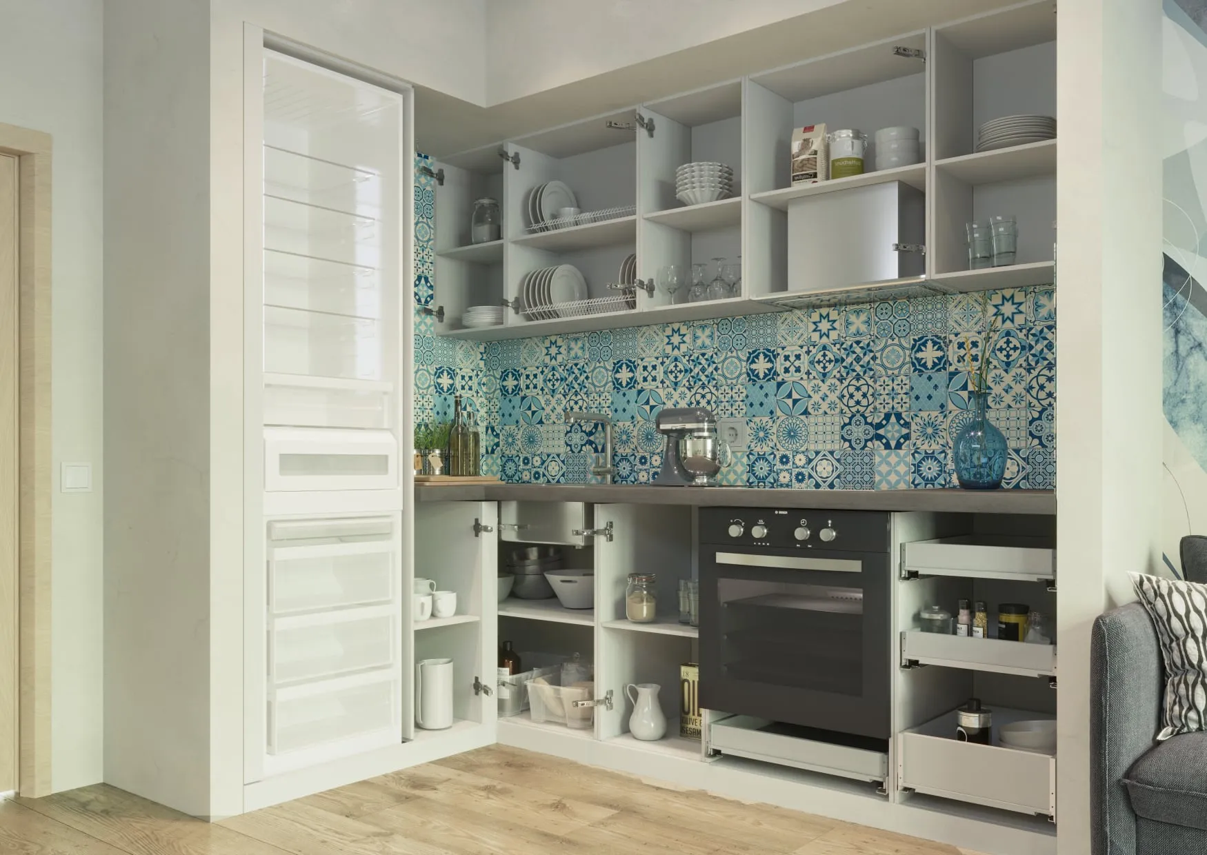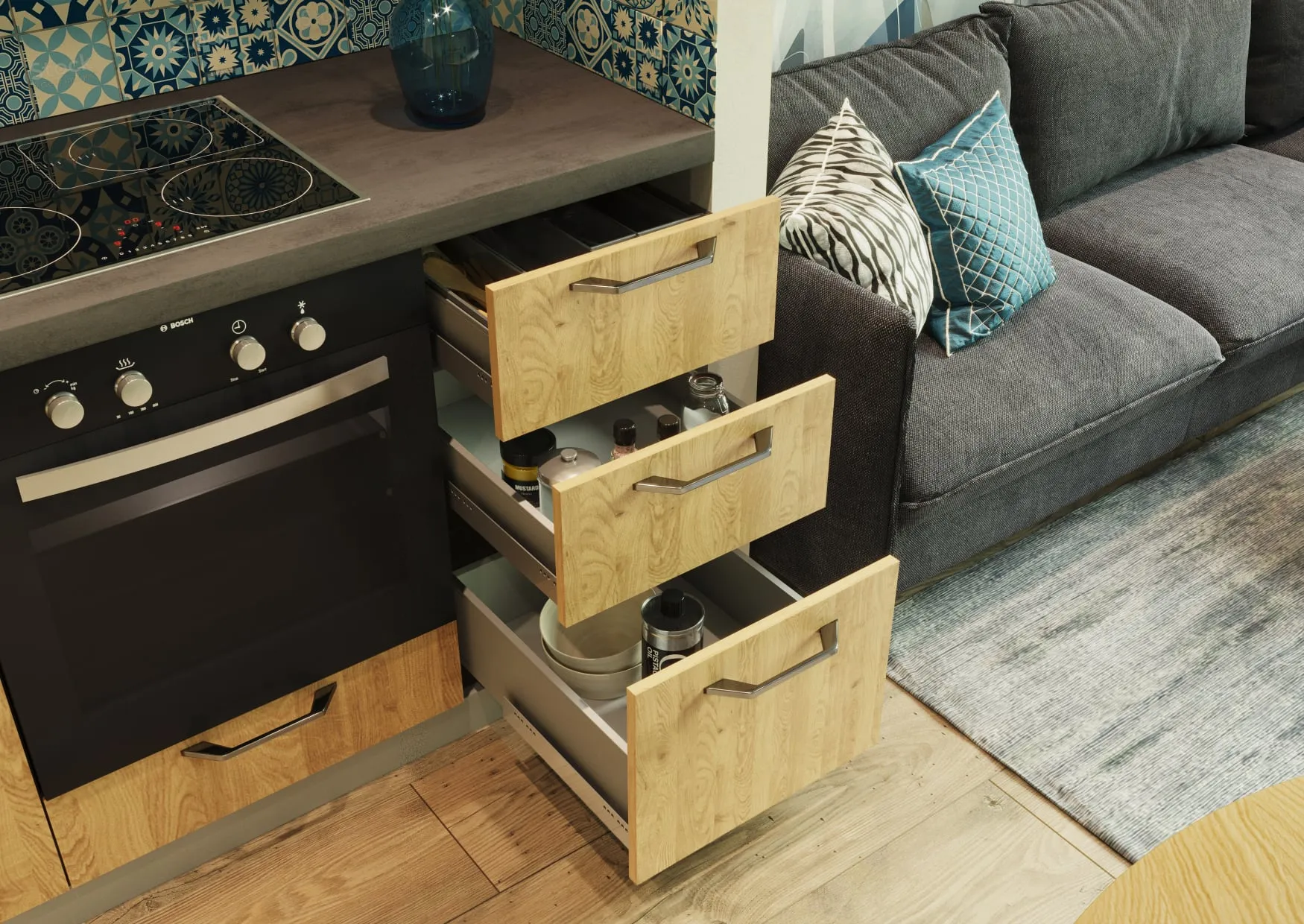 Механизмы открывания: петли BOYARD с доводчиком, направляющие Quadro 25 (Hettich)
