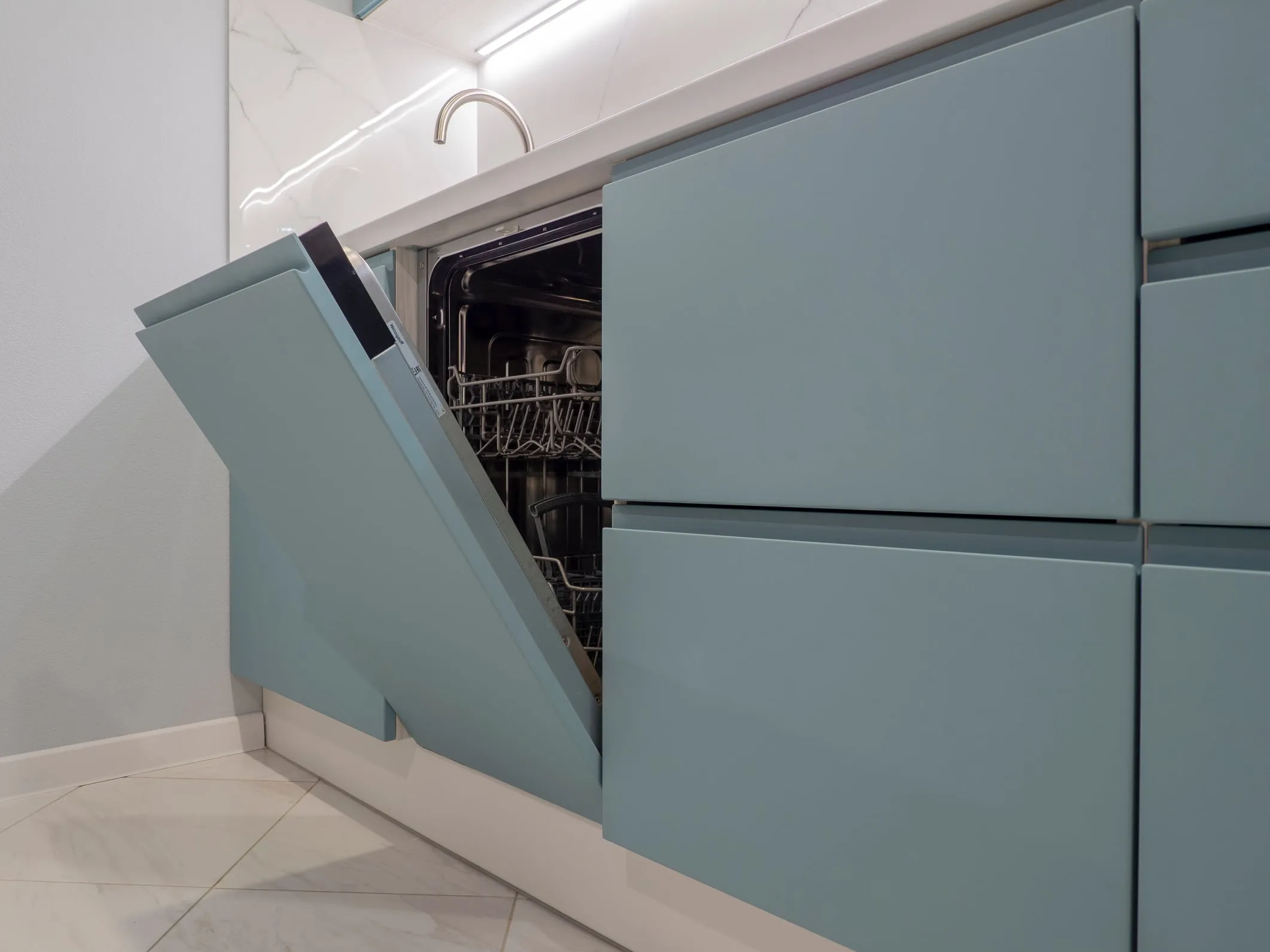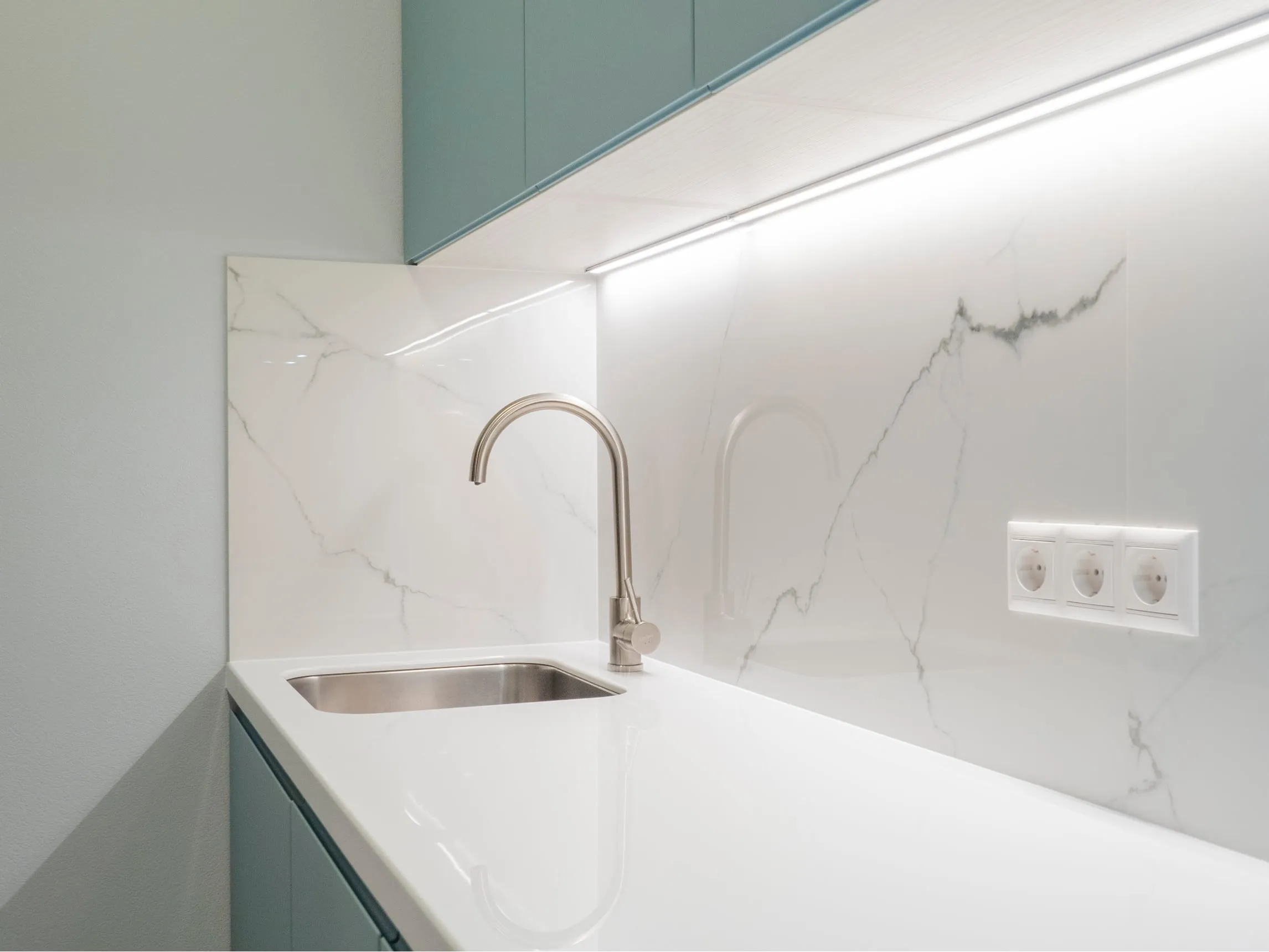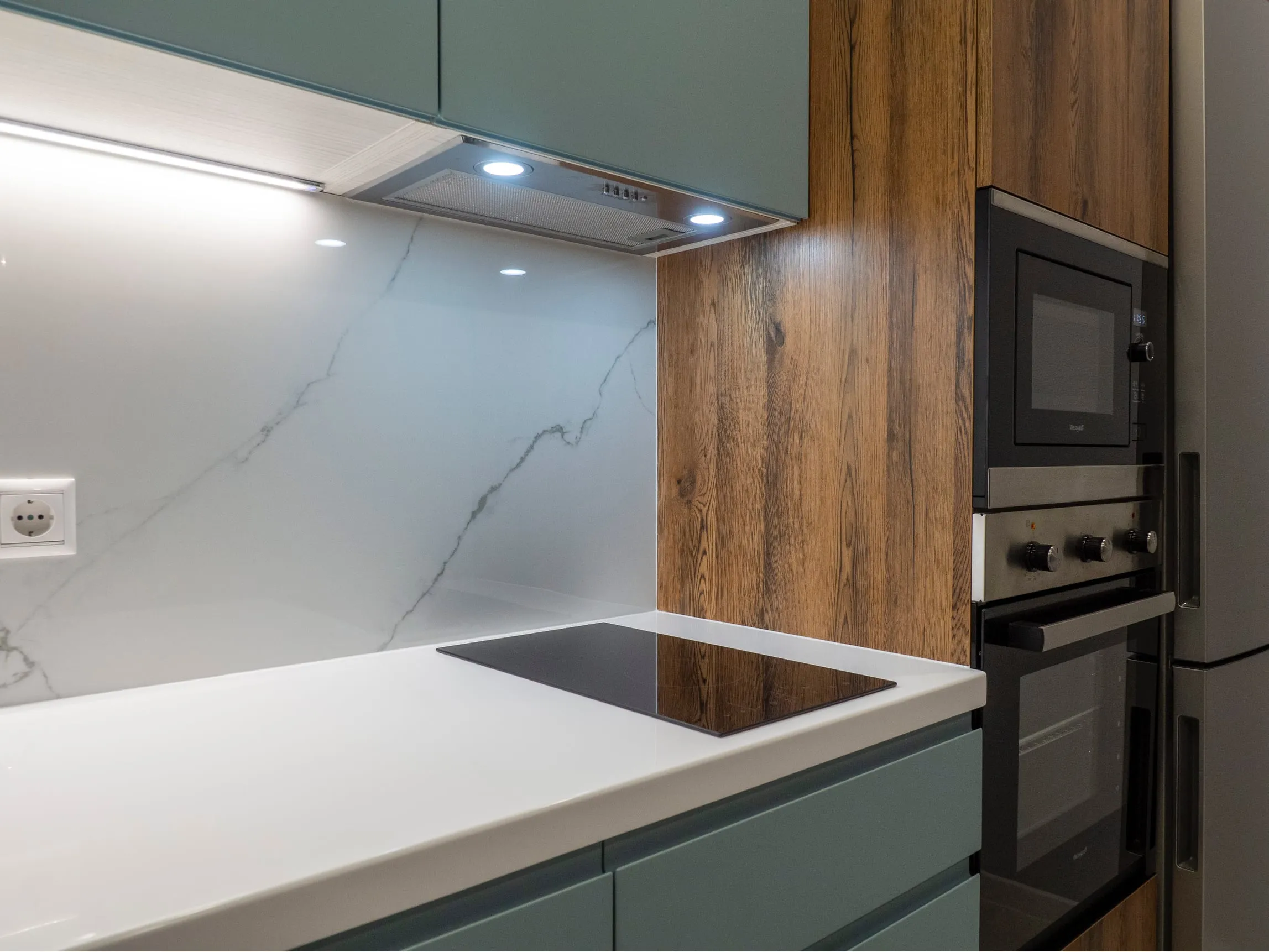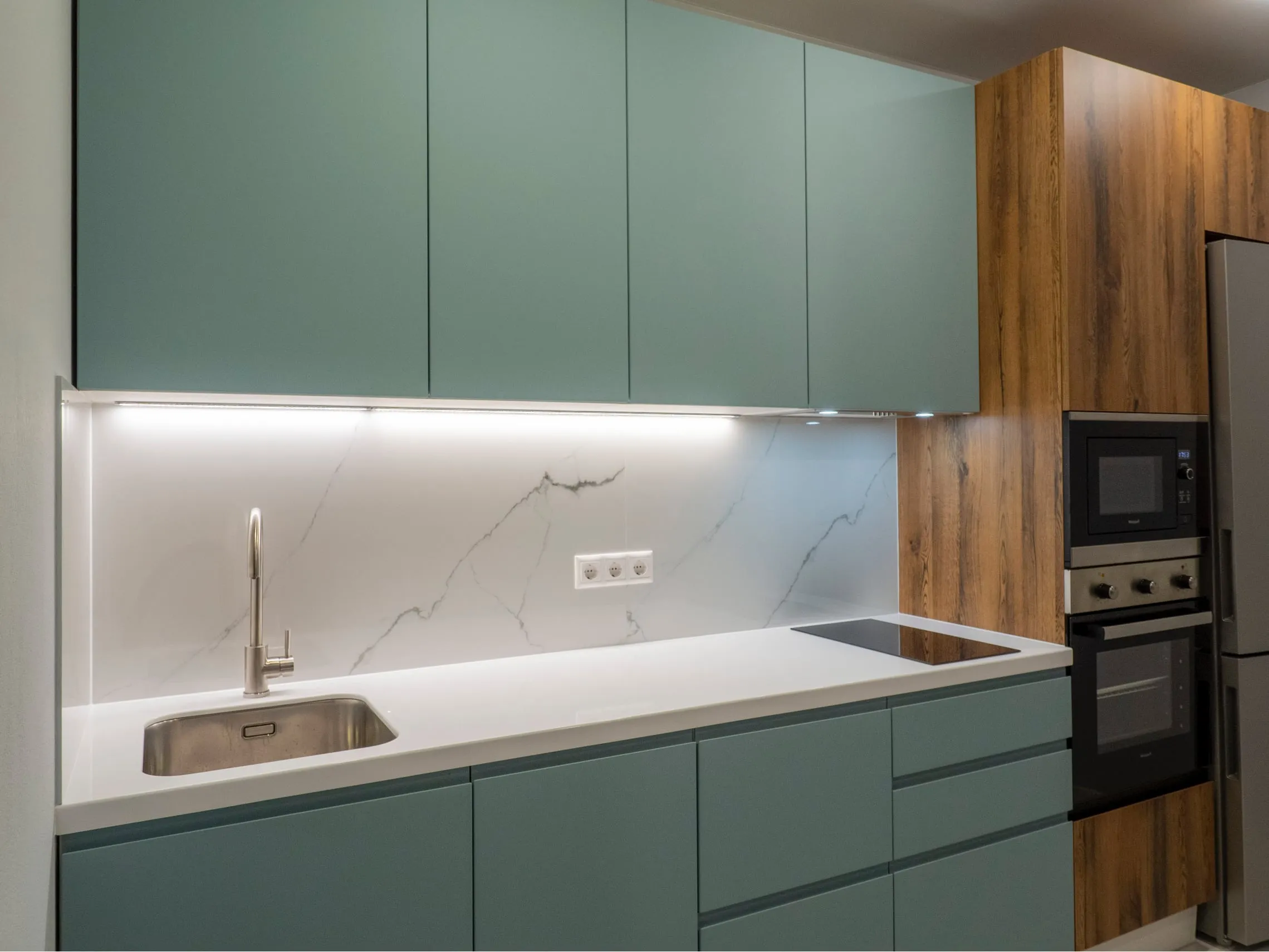 Фасады: МДФ Эмаль, Система NCS S 3010-B30G СМАТ / ЛДСП Тимбер Атик