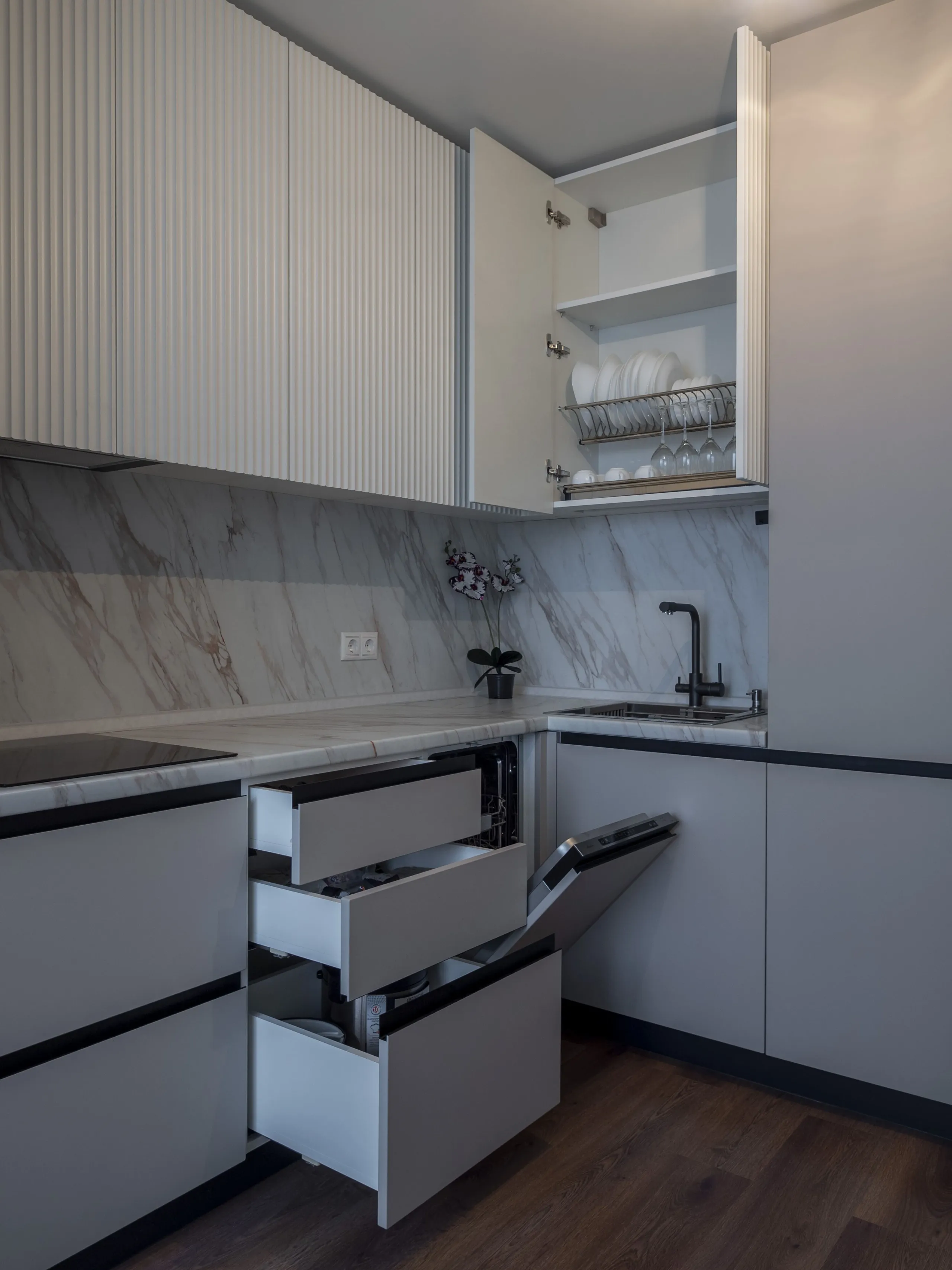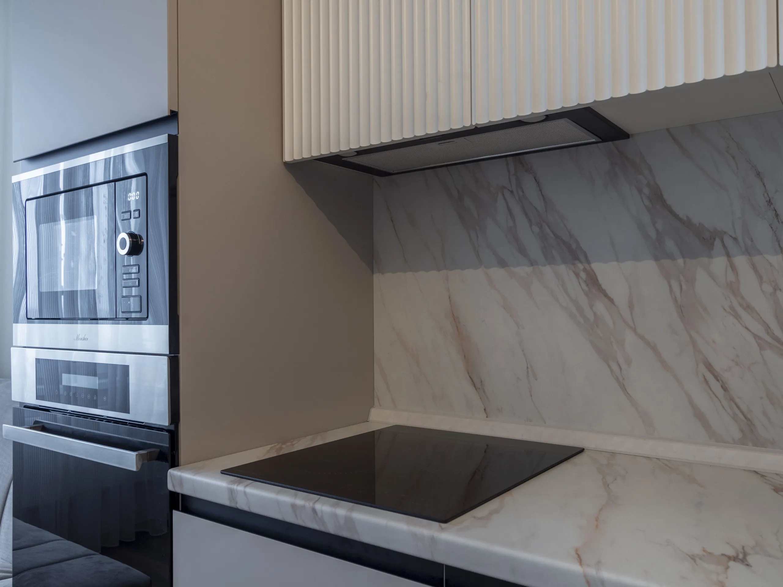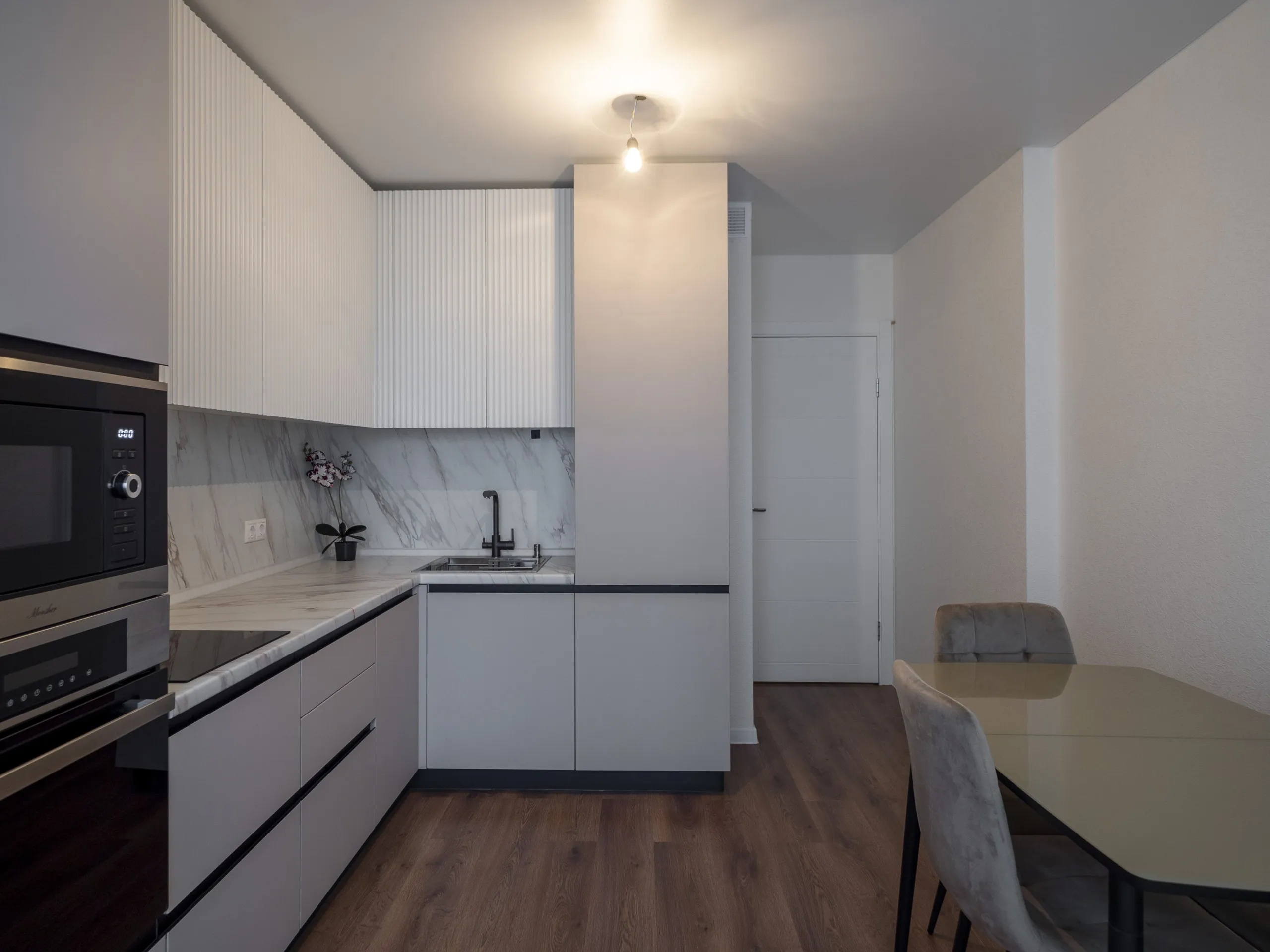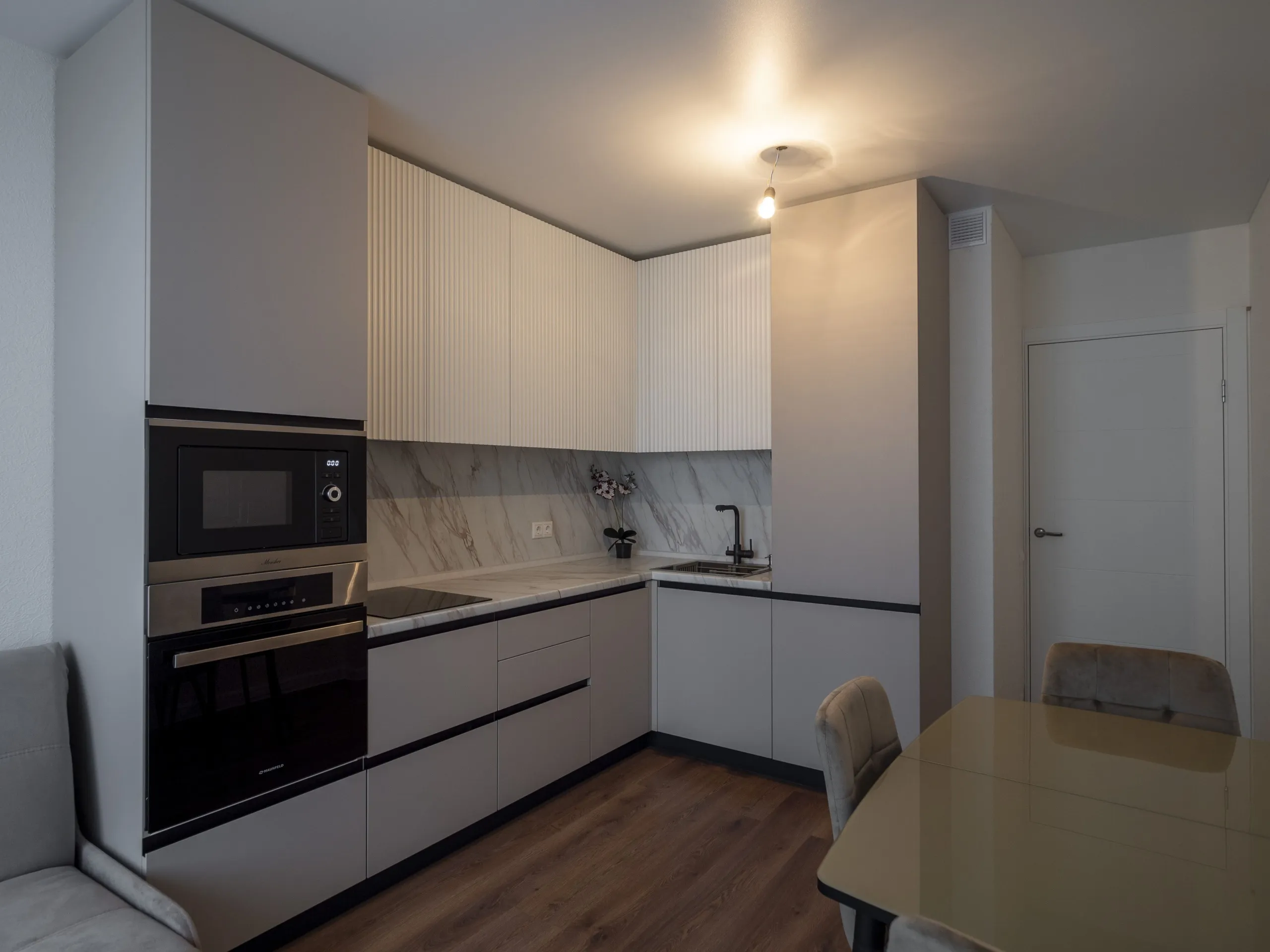 Техника: мойка и смеситель - EMAR, измельчитель - BONE CRUSHER, встроенный духовой шкаф, встроенная электрическая варочная панель, встроенная СВЧ, встроенная вытяжка, встроенная ПММ, встроенный холодильник - KORTING