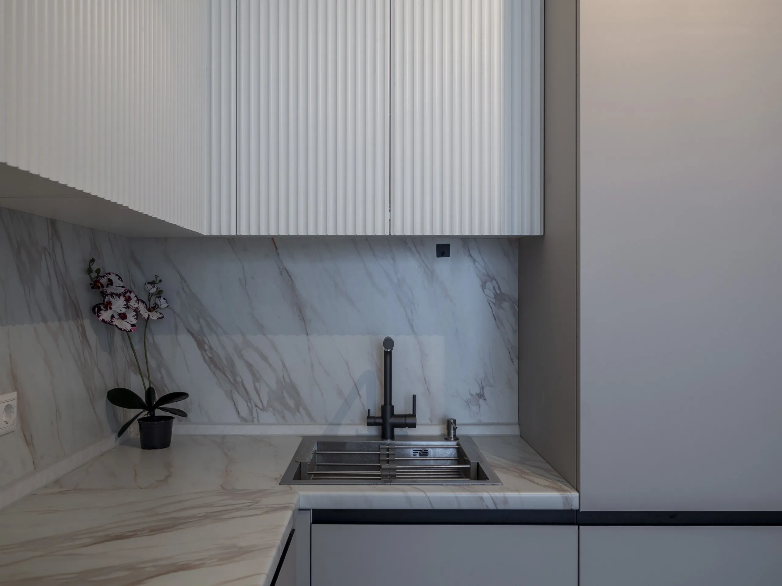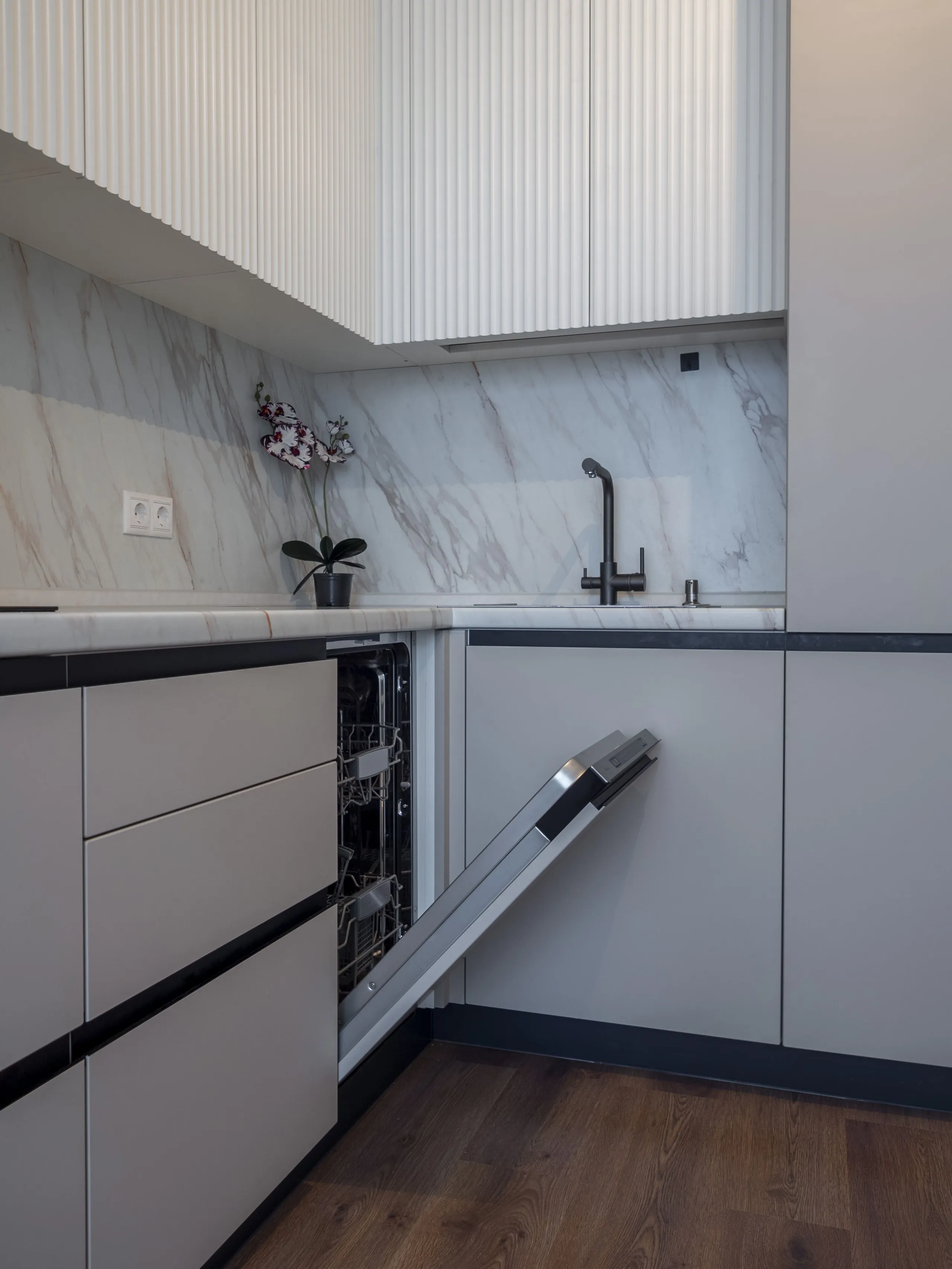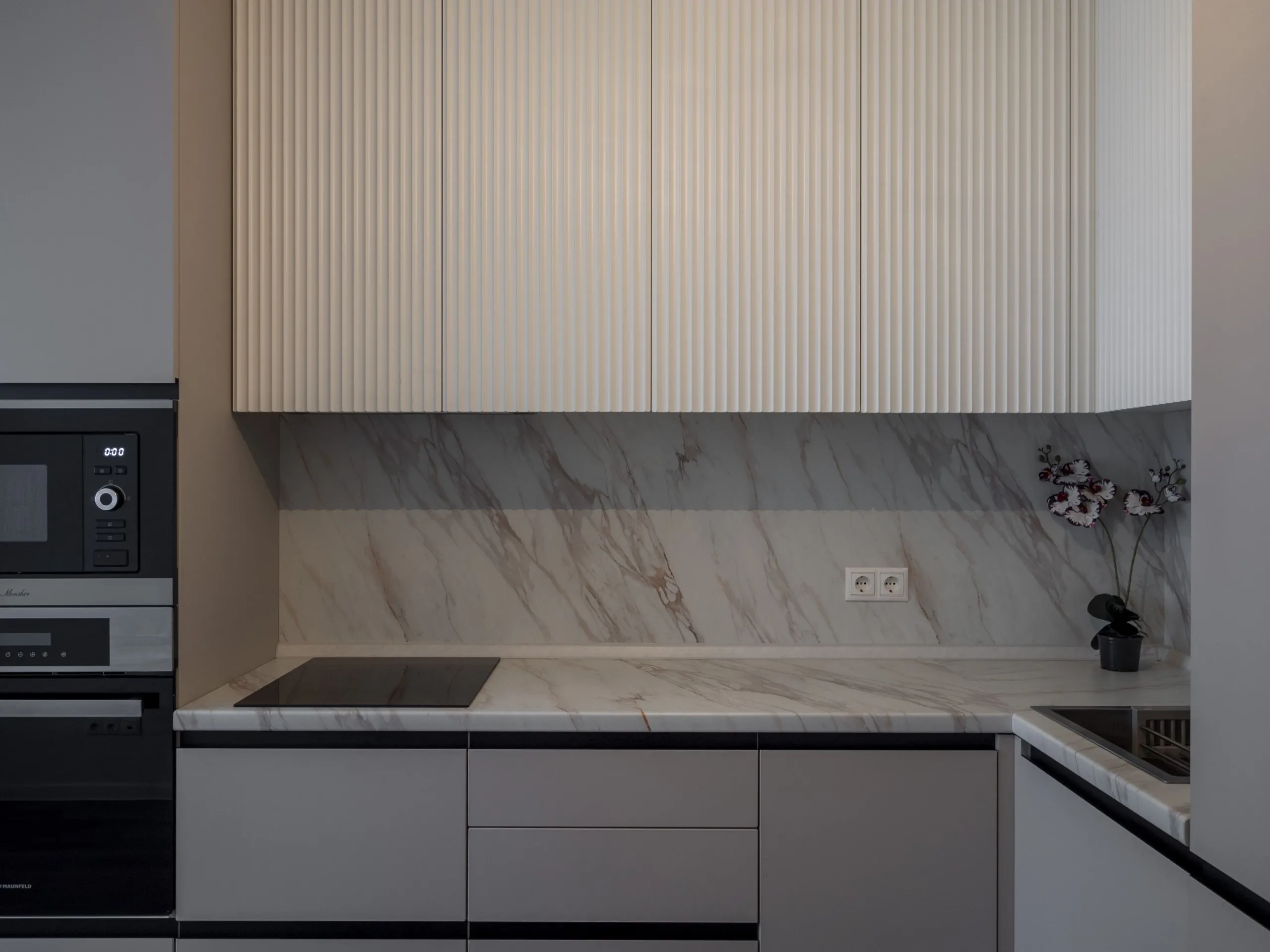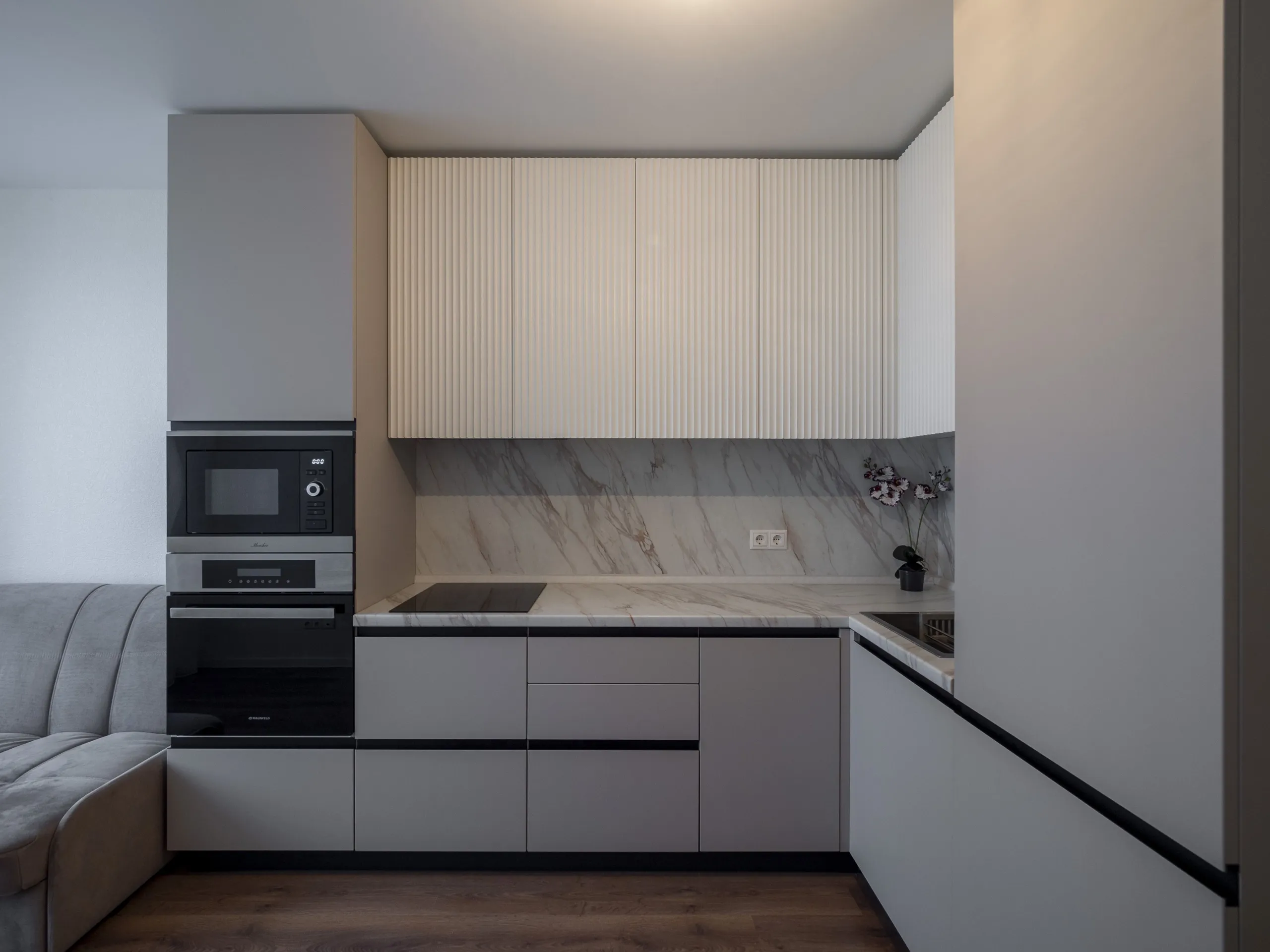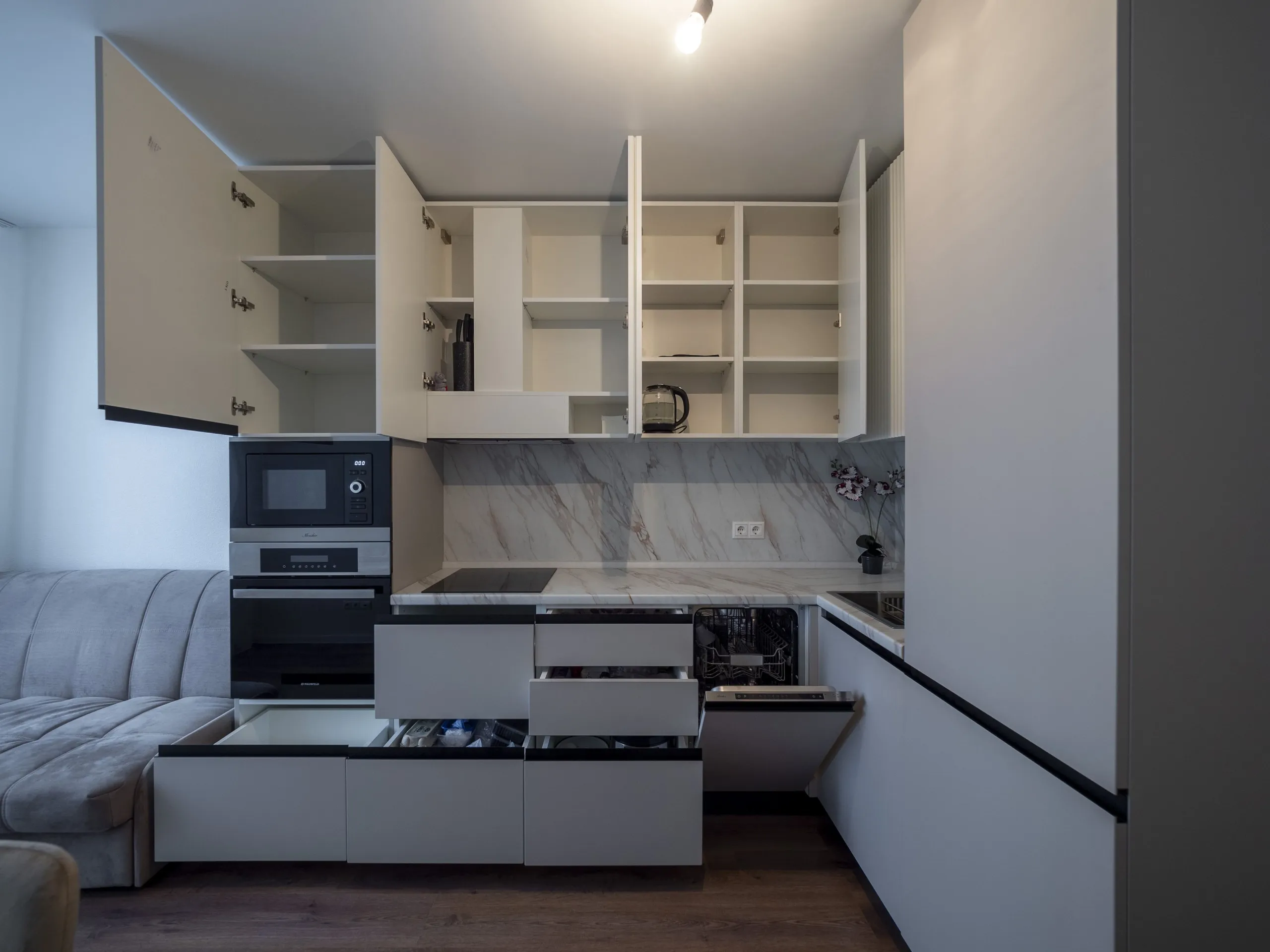 Техника: мойка и смеситель - EMAR, измельчитель - BONE CRUSHER, встроенный духовой шкаф, встроенная электрическая варочная панель, встроенная СВЧ, встроенная вытяжка, встроенная ПММ, встроенный холодильник - KORTING